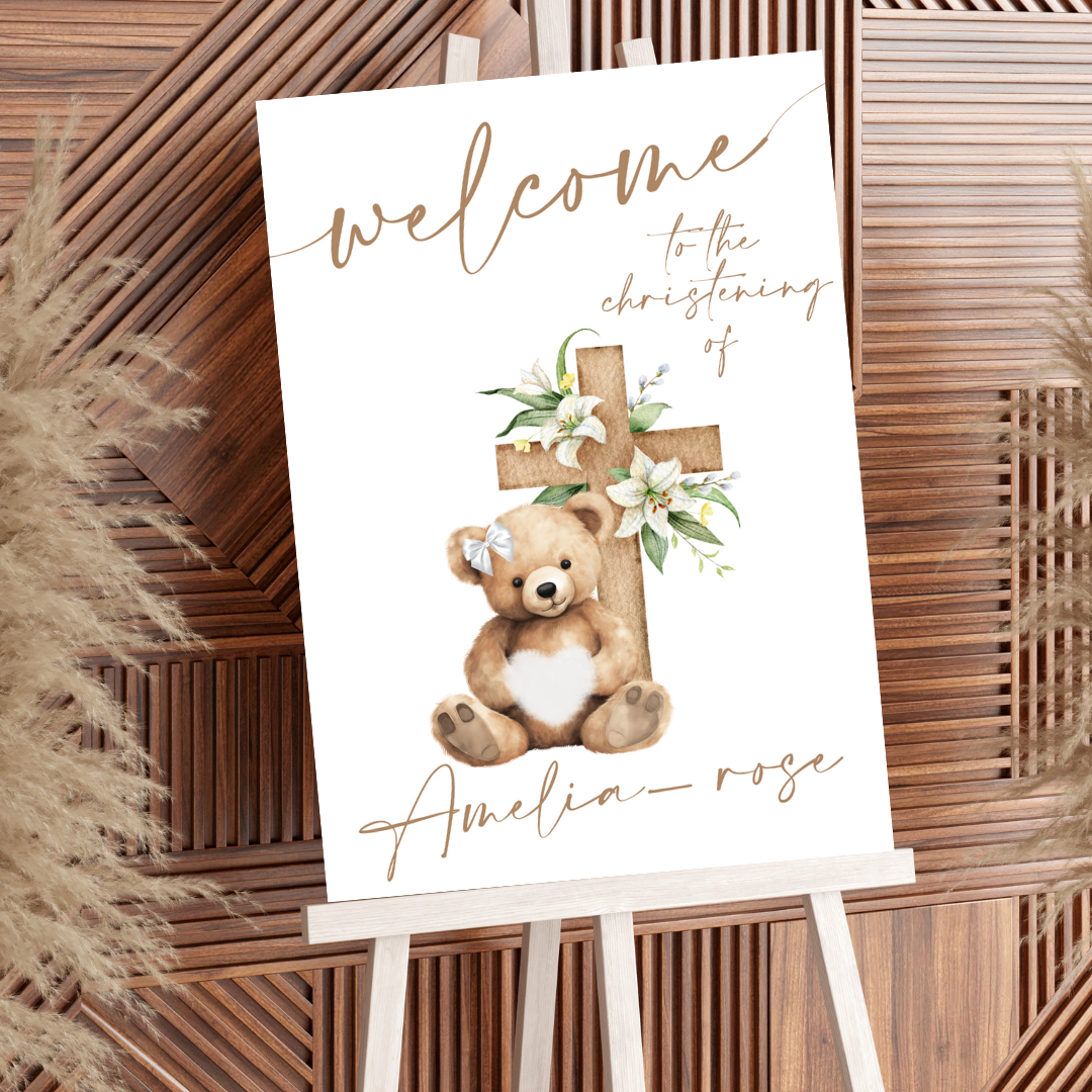 Girly Teddy Bear with Bow Neutral Bear Christening A3 Board Sign