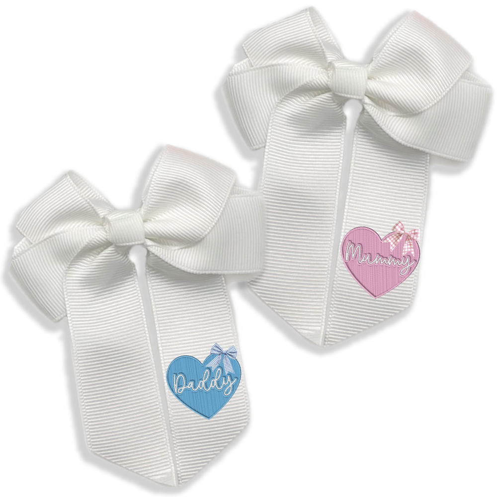 DTF MINI BOW TRANSFERS- EMBROIDERED MUMMY & DADDY HEARTS