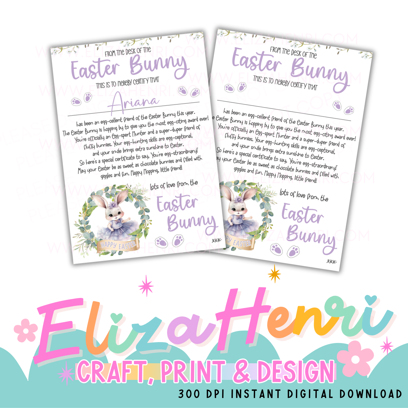 Girls Lilac Easter Bunny Wreath Certificates Digital Download