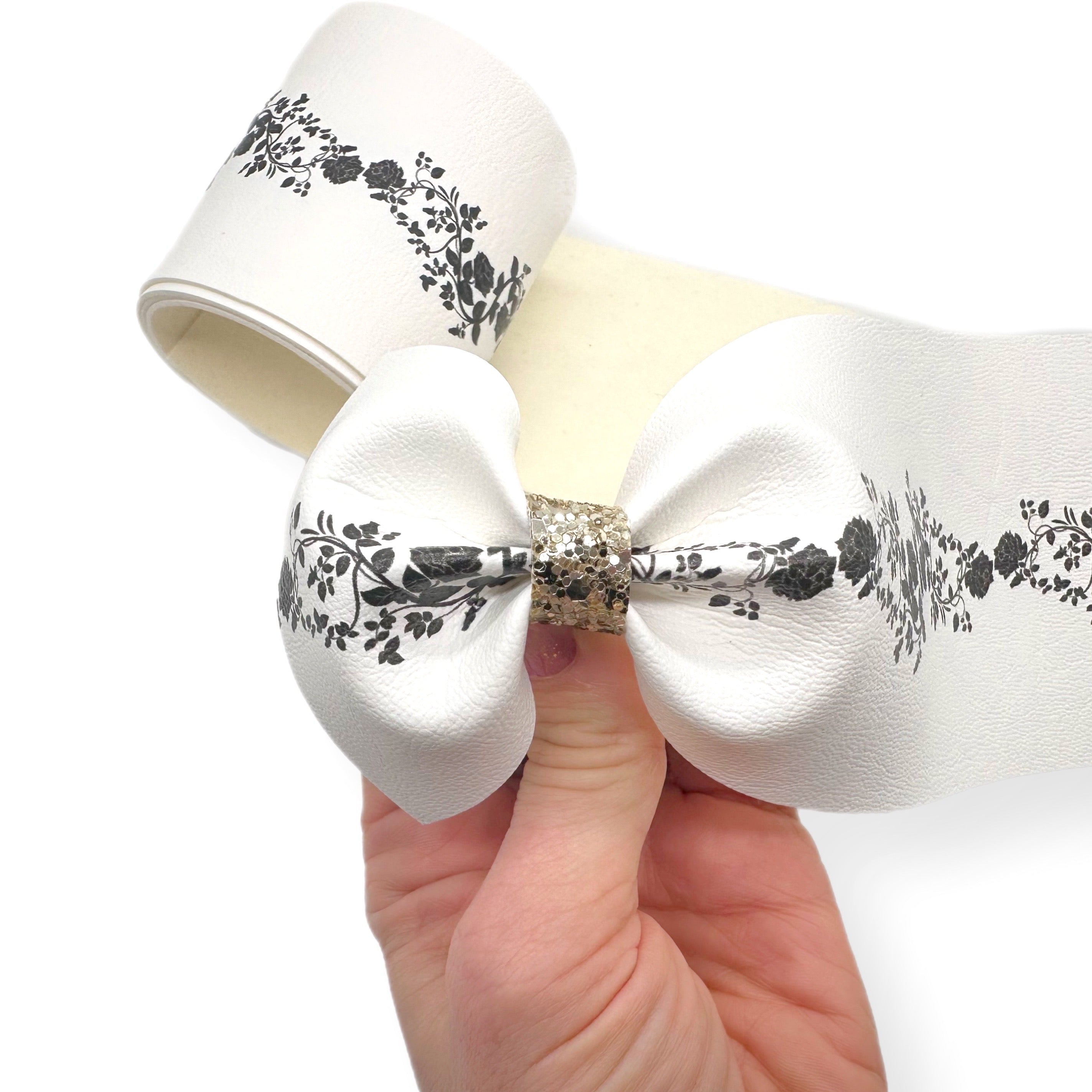 These beautiful, high quality patterned faux leather mega bow rolls are approximately 3” tall and 130cm long. Our Reach compliant faux leather rolls can be used for pinch bows or regular bows with very little wastage.