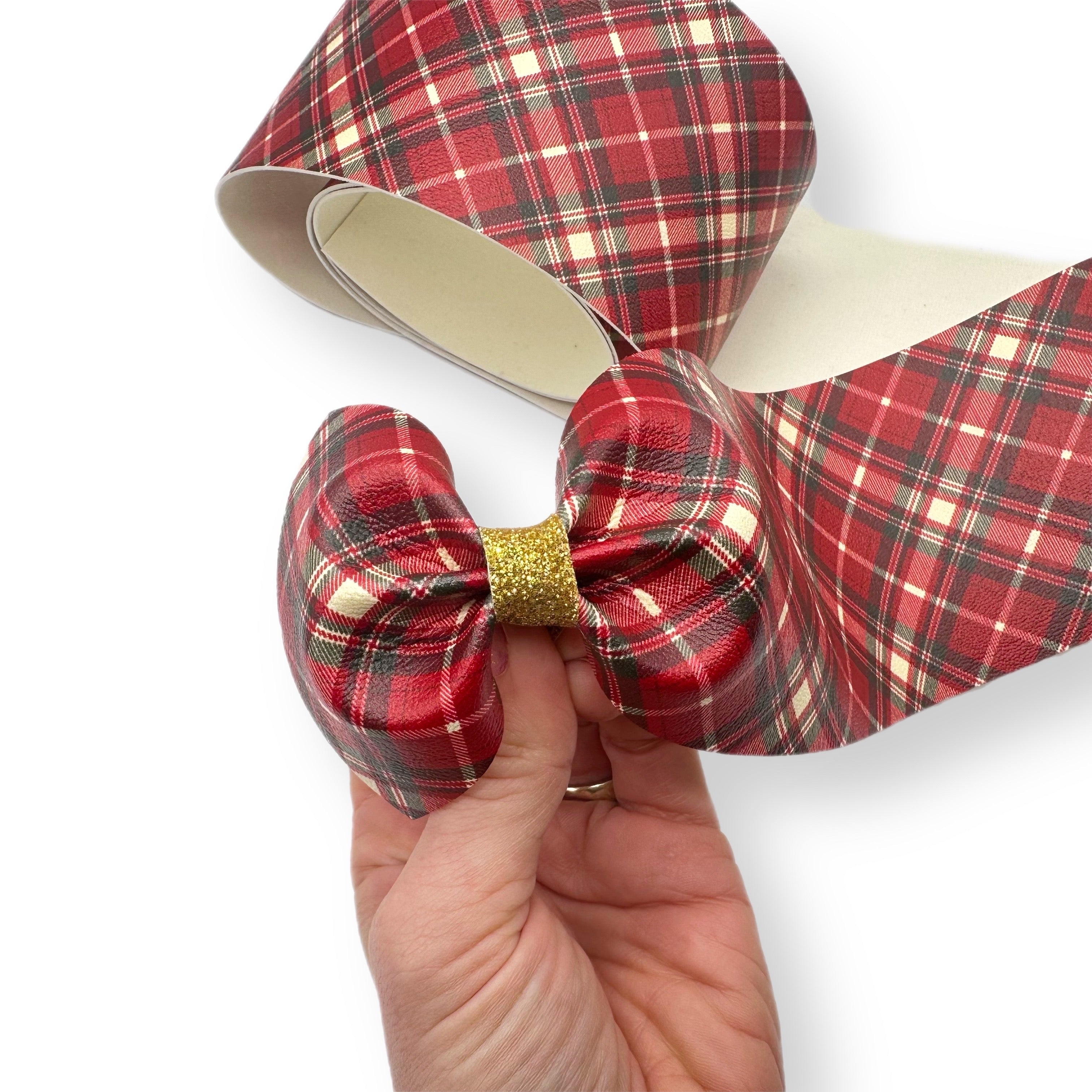 Red & Cream Tartan Faux Leather Mega Bow Strips- 2 Sizes