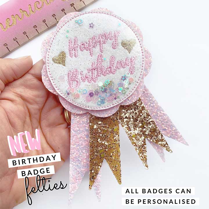 Our beautiful Embroidered birthday badges are an exclusive and unique design to EHC as they are made to match perfectly with our birthday badge template and die cutters. Badges come uncut and all you need is a sharp pair of scissors to carefully cut around the outside of the embroidery and then you can just attach your badge to your badge template using hot glue.