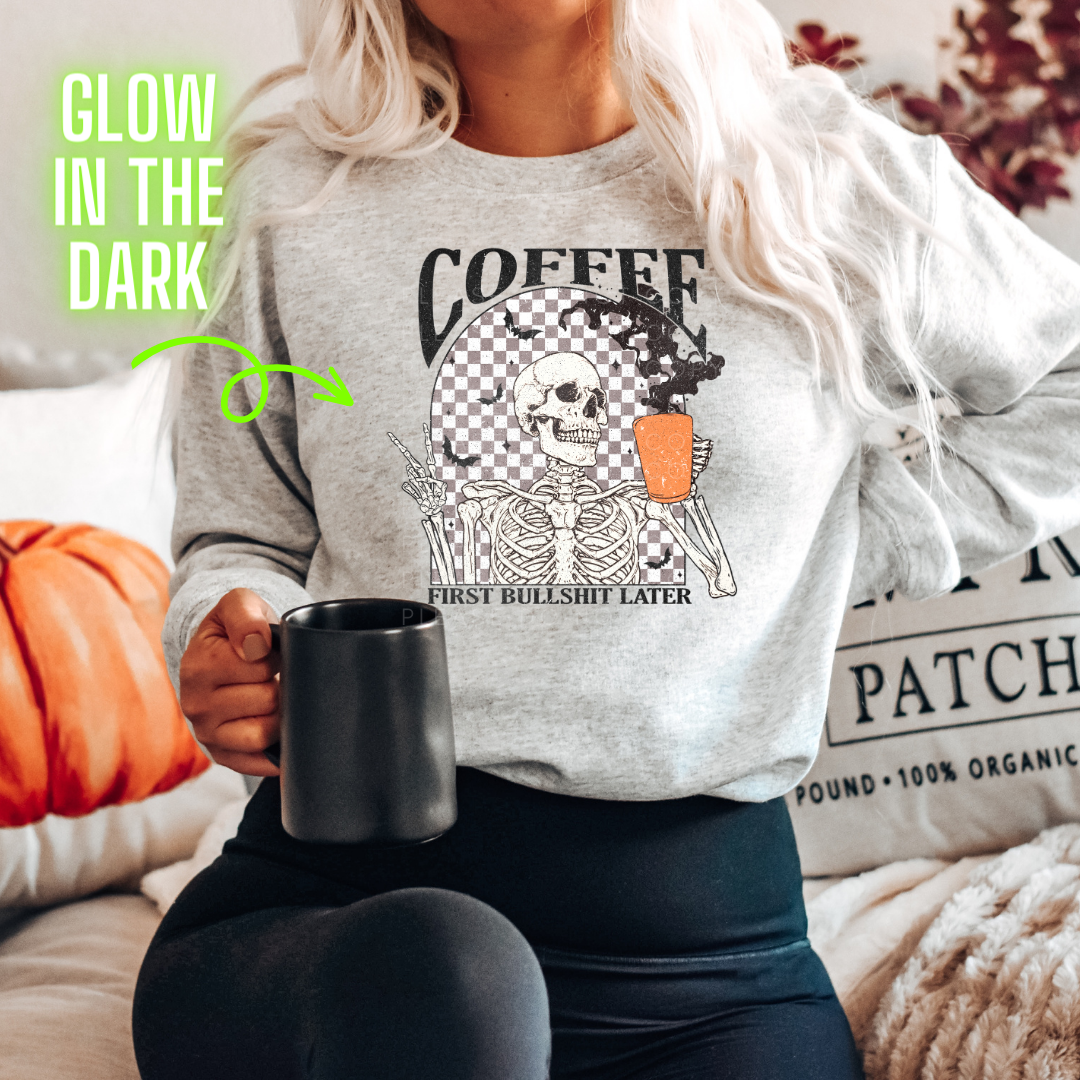 Coffee first bullsh@t later Glow in the Dark Full Colour Iron on T Shirt Transfers