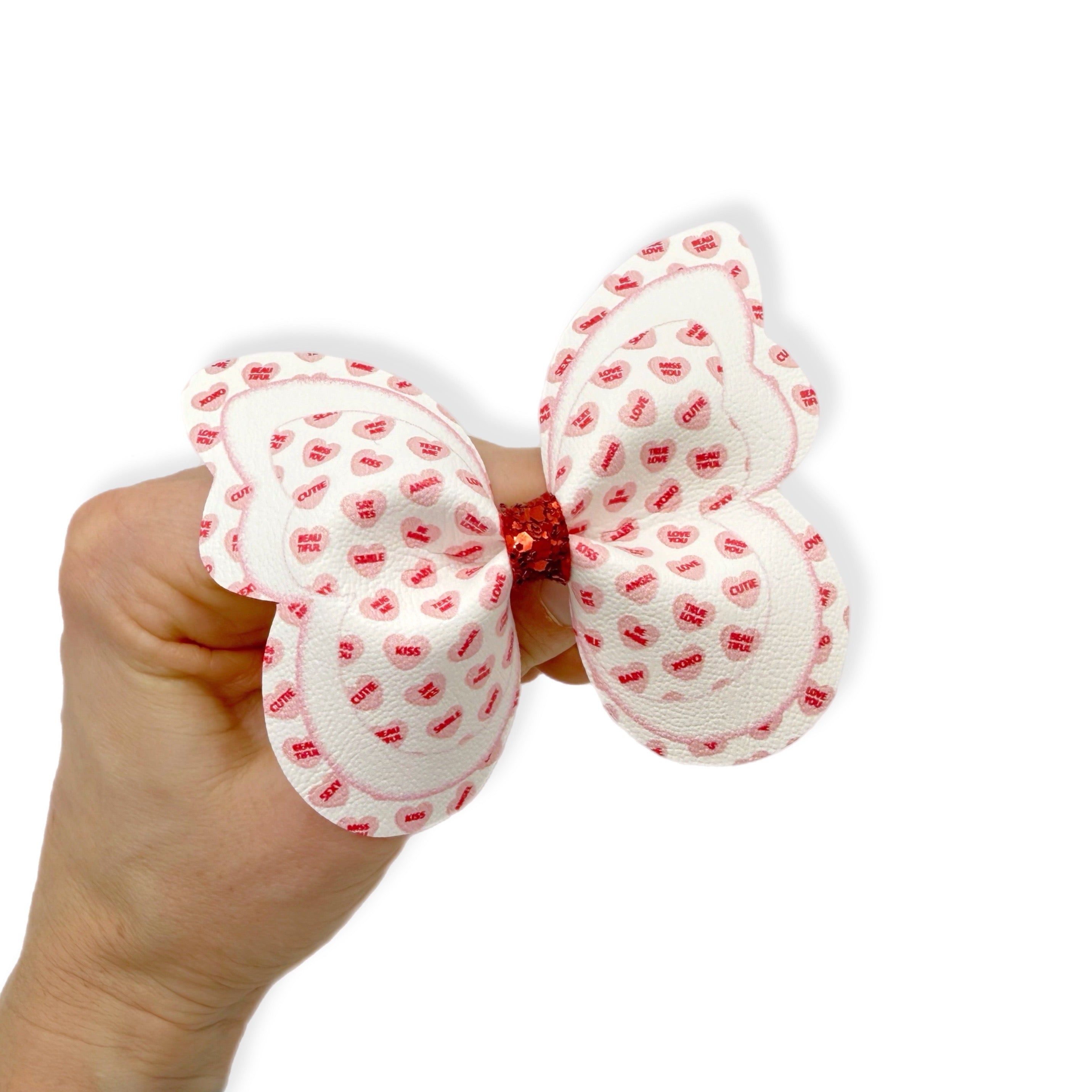 PINK CANDY HEARTS BUTTERFLY PINCH BOWS - DIY CUT OUT FAUX LEATHER FABRIC SHEETS