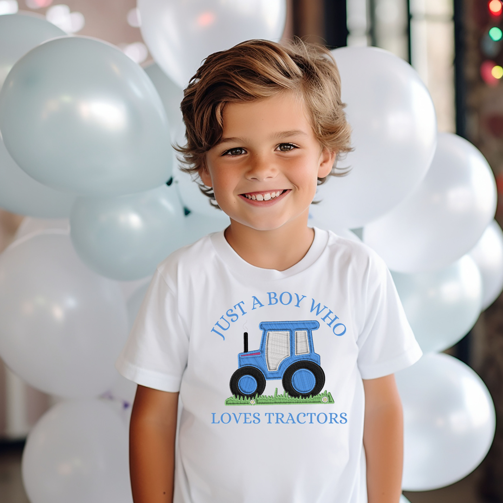 DTF TRANSFER - EMBROIDERY EFFECT- JUST A BOY WHO LOVES TRACTORS- BLUE OR GREEN