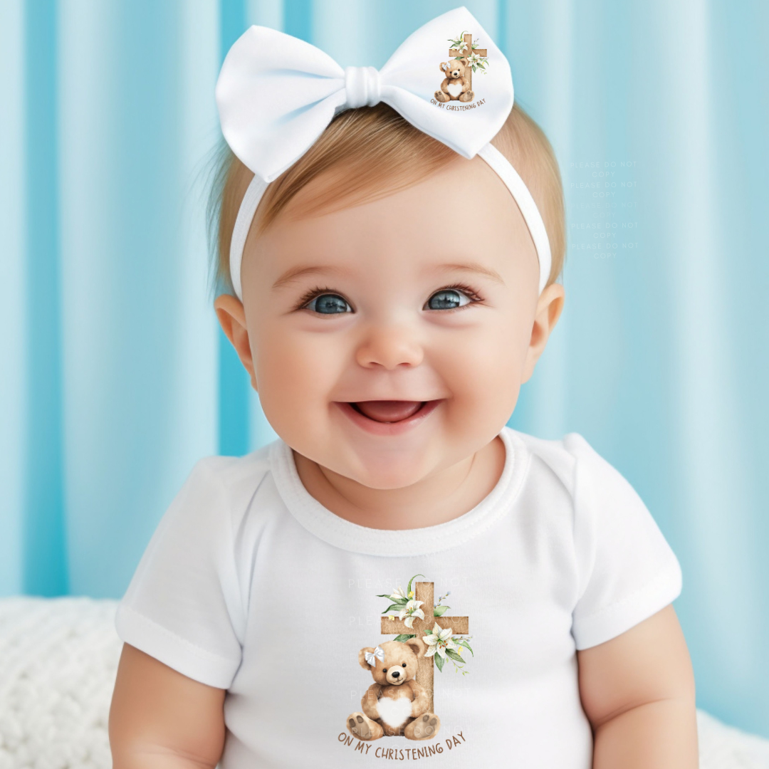 Neutral Girl Teddy Bear with a Bow On MY Christening Day DTF Full Colour Transfers