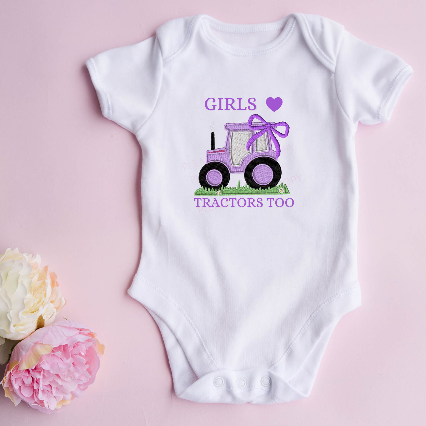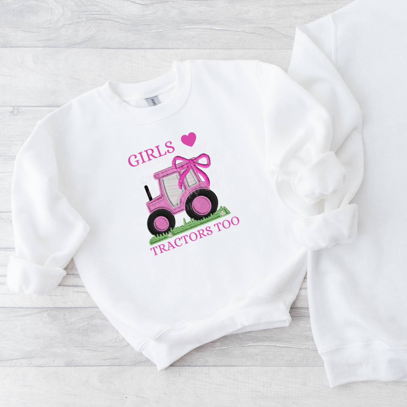 DTF TRANSFER - EMBROIDERY EFFECT- GIRLS LOVE TRACTORS TOO- PINK OR LILAC