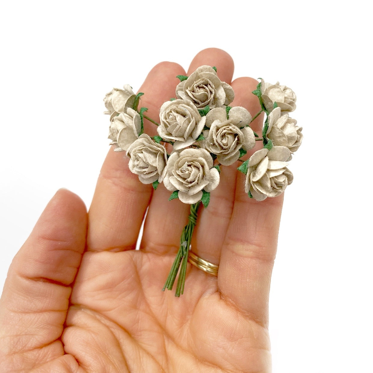 Please note as these are paper they are of a delicate nature and although we do our best to handle with care they may need to be played around with a little to fix them on arrival. They are in bundles of 10 roses and are attached on wire that can be snipped off to sit flat on your creations. Each flower comes with a stem 6-7 cm approx. in length.