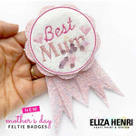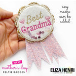 Our beautiful Embroidered mothers day badges are an exclusive and unique design to EHC as they are made to match perfectly with our birthday badge template and die cutters. Badges come uncut and all you need is a sharp pair of scissors to carefully cut around the outside of the embroidery and then you can just attach your badge to your badge template using hot glue.