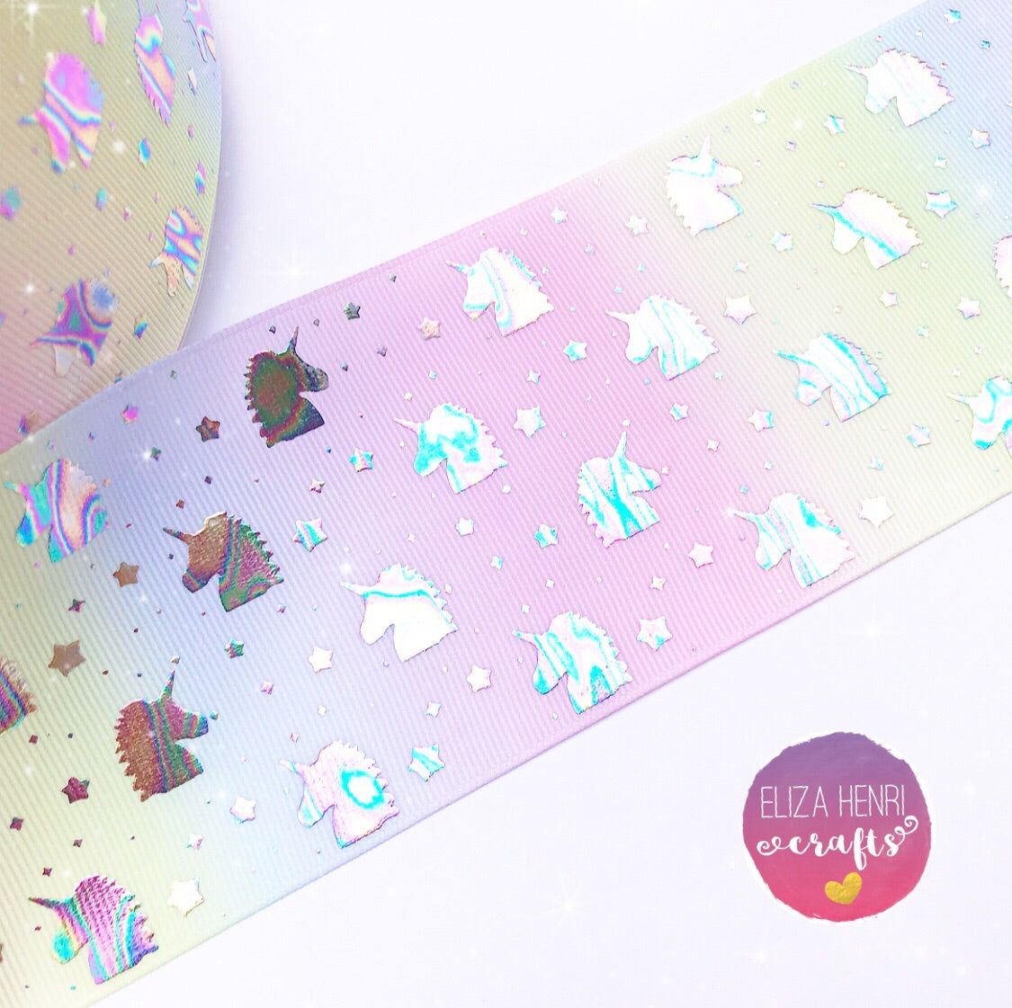 Pastel Rainbow Mini Holographic Unicorn Heads Foil Grosgrain Ribbon 3''