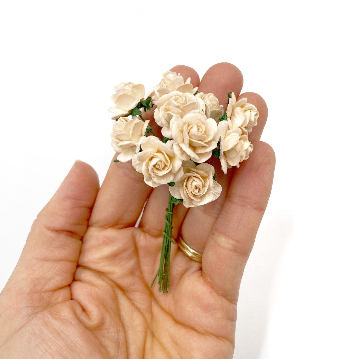 Please note as these are paper they are of a delicate nature and although we do our best to handle with care they may need to be played around with a little to fix them on arrival. They are in bundles of 10 roses and are attached on wire that can be snipped off to sit flat on your creations. Each flower comes with a stem 6-7 cm approx. in length.