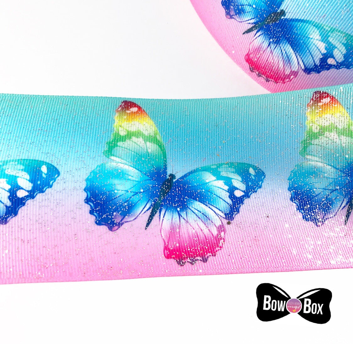 Pink Aqua Butterfly Glitter Grosgrain Ribbon 3''