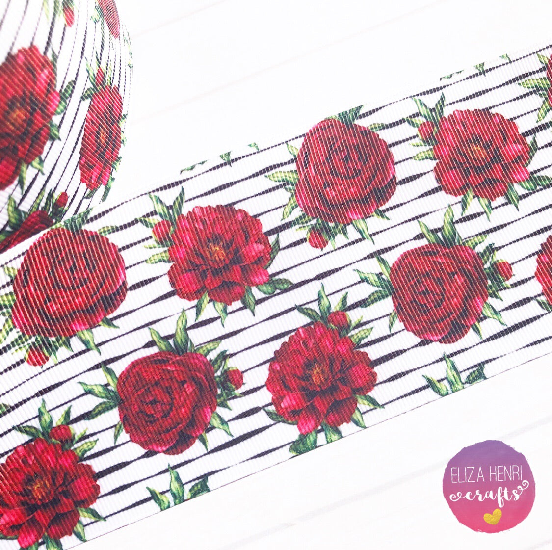 A beautiful high quality rose design stripe on white coloured grosgrain ribbon.