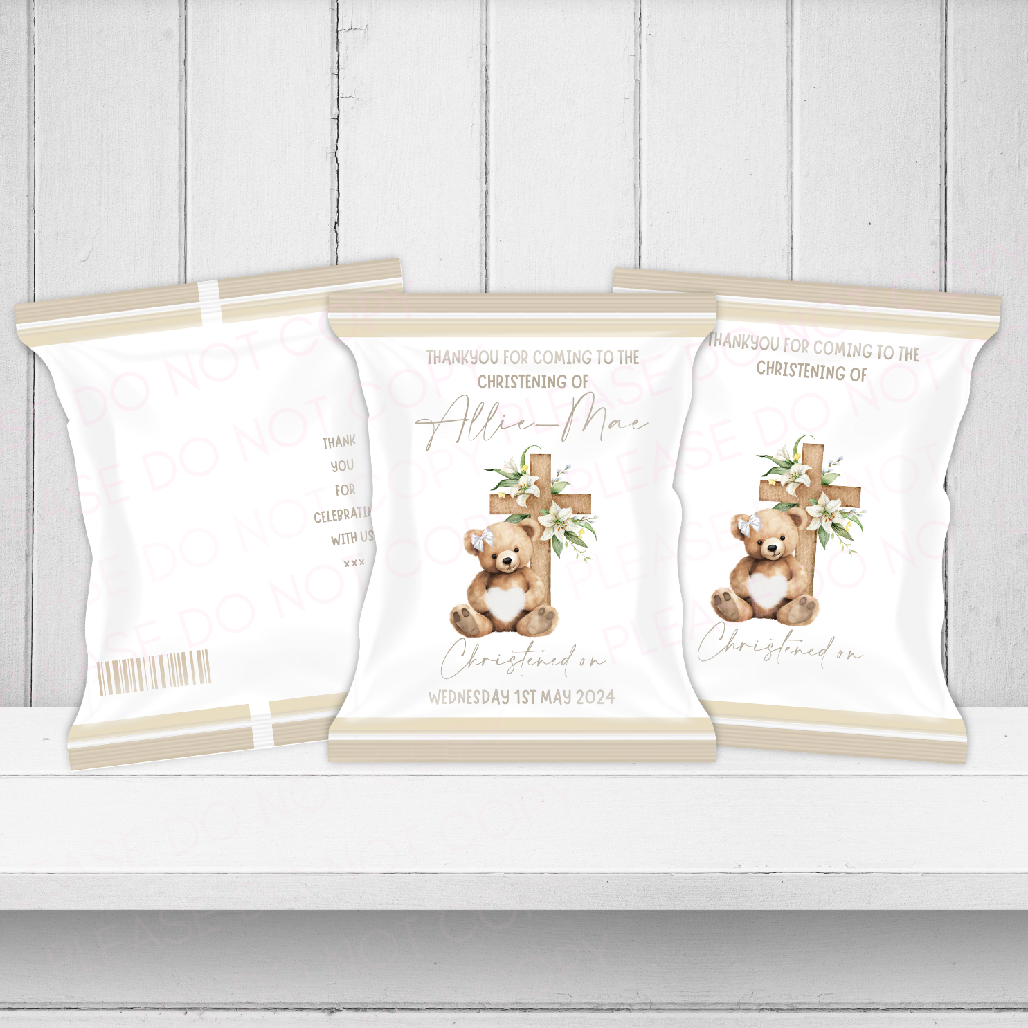 Girl Teddy Bear with Bow & White Fluffy Heart Christening DIY Treat Packs